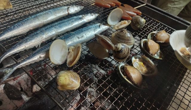 旬なこの時期にさんまやアワビ、はまぐりなど網で焼いて食べるのですが外での網焼きはやっぱり美味しさが違いました。