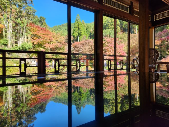 漆塗りのテーブルに反射した紅葉がとても綺麗でした。